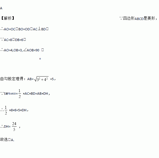 如图,四边形ABCD是菱形,AC=8,DB=6,DH⊥AB于点H,则DH等于( )