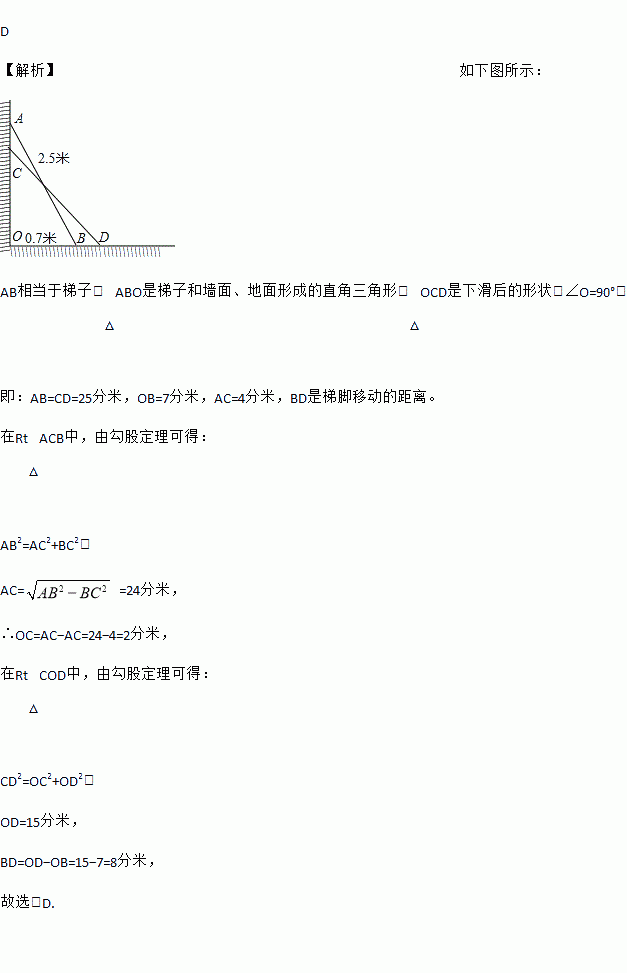 D 【解析】如下图所示: AB相当于梯子,△ABO是梯子和墙面、地面形成的直角三角形,△OCD是下滑后的形状,∠O=90°, 即:AB=CD=25分米,OB=7分米,AC=4分米,BD是梯脚移动的距离。 在Rt△ACB中,由勾股定理可得: AB2=AC2+BC2, AC= =24分米, ∴OC=AC?AC=24?4=2分米, 在Rt△COD中,由勾股...