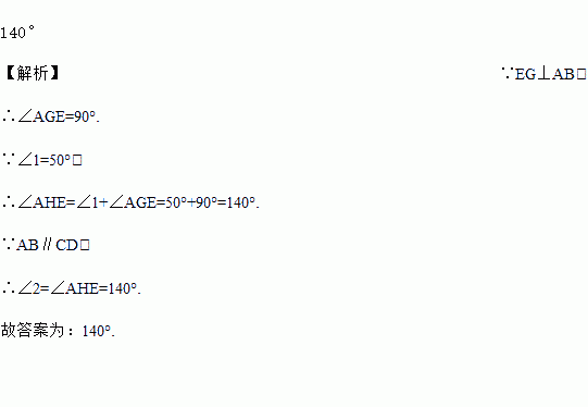 如图,已知直线AB∥CD,直线EG垂直于AB,垂足为G,直线EF交CD于点F,∠1=50°,则∠2=_____.