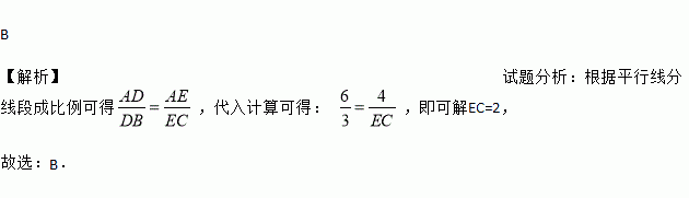 B 【解析】试题分析:根据平行线分线段成比例可得,代入计算可得: ,即可解EC=2, 故选:B.