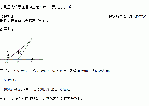 “五•一”期间,小明到小陈家所在的美丽乡村游玩,在村头A处小明接到小陈发来的定位,发现小陈家C在自己的北偏东45°方向,于是沿河边笔直的绿道l步行200米到达B处,这时定位显示小陈家C在自己的北偏东30°方向,如图所示,根据以上信息和下面的对话,请你帮小明算一算他还需沿绿道继续直走多少米才能到达桥头D处(精确到1米)(备用数据: