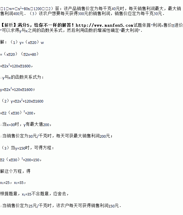 为了落实国务院的指示精神,政府出台了一系列“三农”优惠政策,使农民收入大幅度增加.某农户生产经销一种农产品,已知这种产品的成本价为每千克20元,市场调查发现,该产品每天的销售量y(千克)与销售价x(元/千克)有如下关系:y=﹣x+60.设这种产品每天的销售利润为w元.