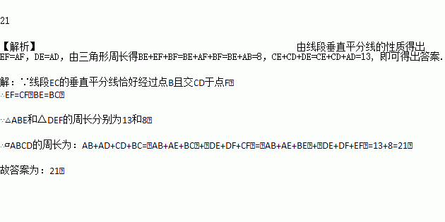 如图,点E为□ABCD的边BC上一点,线段AE的垂直平分线恰好经过点D且交AB于点F,△BEF和△CDE的周长分别为8和13,则□ABCD的周长为______________.