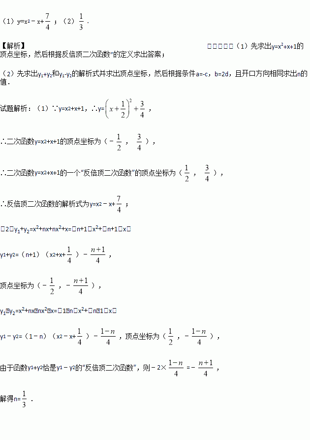 (2)已知关于x的二次函数y1=x2+nx和二次函数y2=nx2+x,函数y1+y2恰是y1﹣y2的“反倍顶二次函数”,求n.
