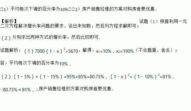 某中心城市有一楼盘,开发商准备以每平方米7000元价格出售,由于国家出台了有关调控房地产的政策,开发商经过两次下调销售价格后,决定以每平方米5670元的价格销售.