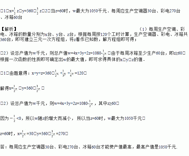 (2)每周应生产空调器、彩电、冰箱各多少台,才能使产值最高?最高产值是多少?(以千元为单位)