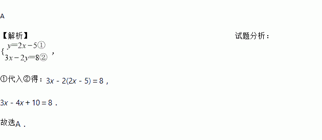 A 【解析】试题分析: , ①代入②得:3x-2(2x-5)=8, 3x-4x+10=8. 故选A.