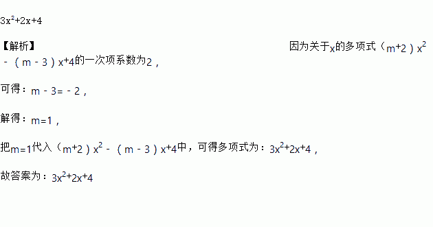3x2+2x+4 【解析】因为关于x的多项式(m+2)x2﹣(m﹣3)x+4的一次项系数为2, 可得:m﹣3=﹣2, 解得:m=1, 把m=1代入(m+2)x2﹣(m﹣3)x+4中,可得多项式为:3x2+2x+4, 故答案为:3x2+2x+4