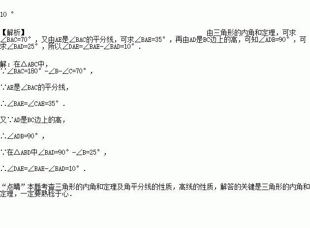 如图,在△ABC中,∠B=65°∠C=45°,AD是BC边上的高,AE是∠BAC的平线,求∠DAE的度数?