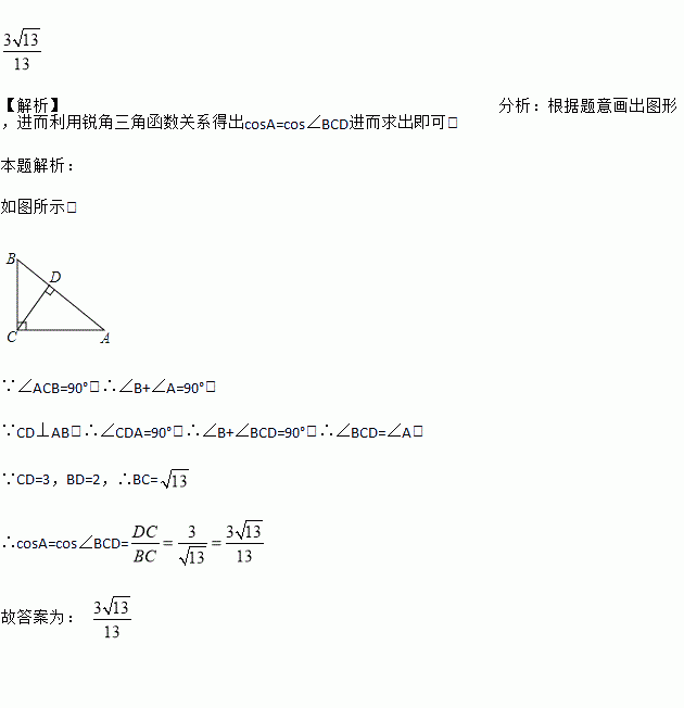 在Rt△ABC中,∠C=90°,CD是斜边AB上的高,如果CD=3,BD=2.求cos∠A的值.
