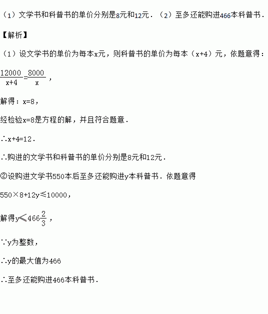 (2)今年文学书和科普书的单价和去年相比保持不变,该校打算用10000元再购进一批文学书和科普书,问购进文学书550本后至多还能购进多少本科普书?