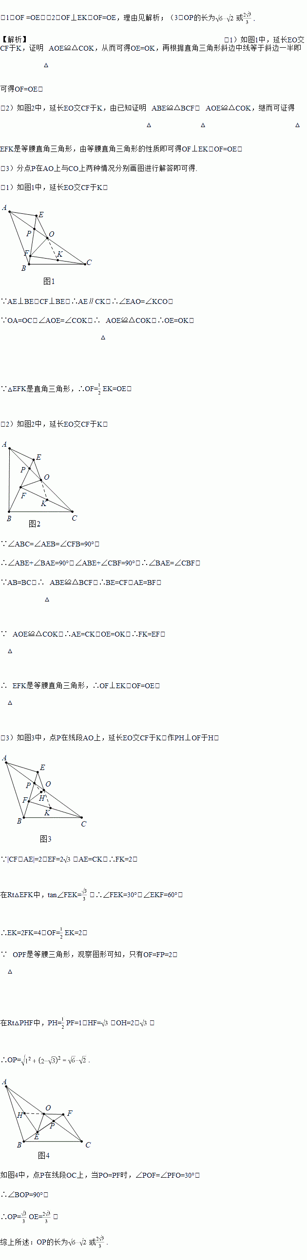 在△ABC中,AB=BC,点O是AC的中点,点P是AC上的一个动点(点P不与点A,O,C重合).过点A,点C作直线BP的垂线,垂足分别为点E和点F,连接OE,OF.