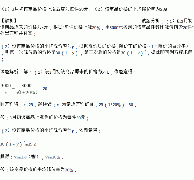 3 月初某商品价格上涨,每件价格上涨 20%.用 3000 元买到的该商品 件数比涨价前少 20 件.3 月下旬该商品开始降价,经过两次降价后,该商品价格为每 件 19.2 元.