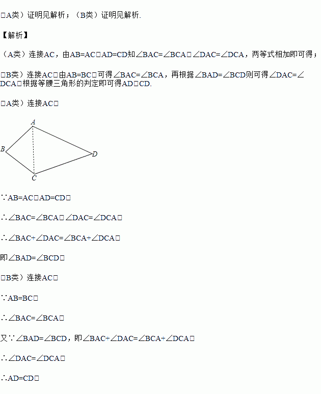 (A类)已知如图,四边形ABCD中,AB=BC,AD=CD,求证:∠A=∠C.