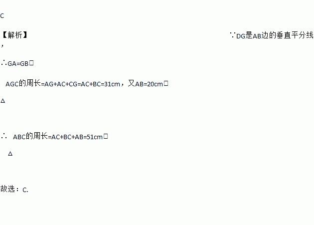 C 【解析】∵DG是AB边的垂直平分线, ∴GA=GB, △AGC的周长=AG+AC+CG=AC+BC=31cm,又AB=20cm, ∴△ABC的周长=AC+BC+AB=51cm, 故选:C.