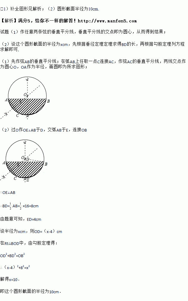 (2)若这个输水管道有水部分的水面宽AB=16cm,水面最深地方的高度为4cm,求这个圆形截面的半径.