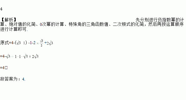 计算:()﹣2﹣|1﹣|﹣(π﹣2015)0﹣2sin60°+=____________.