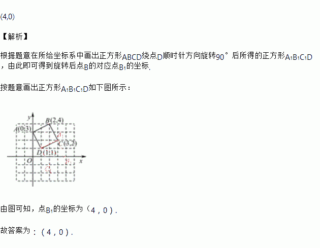 正方形ABCD在坐标系中的位置如图所示,将正方形ABCD绕D点顺时针方向旋转90°后所得正方形为A1B1C1D,则点B1的坐标为___________.