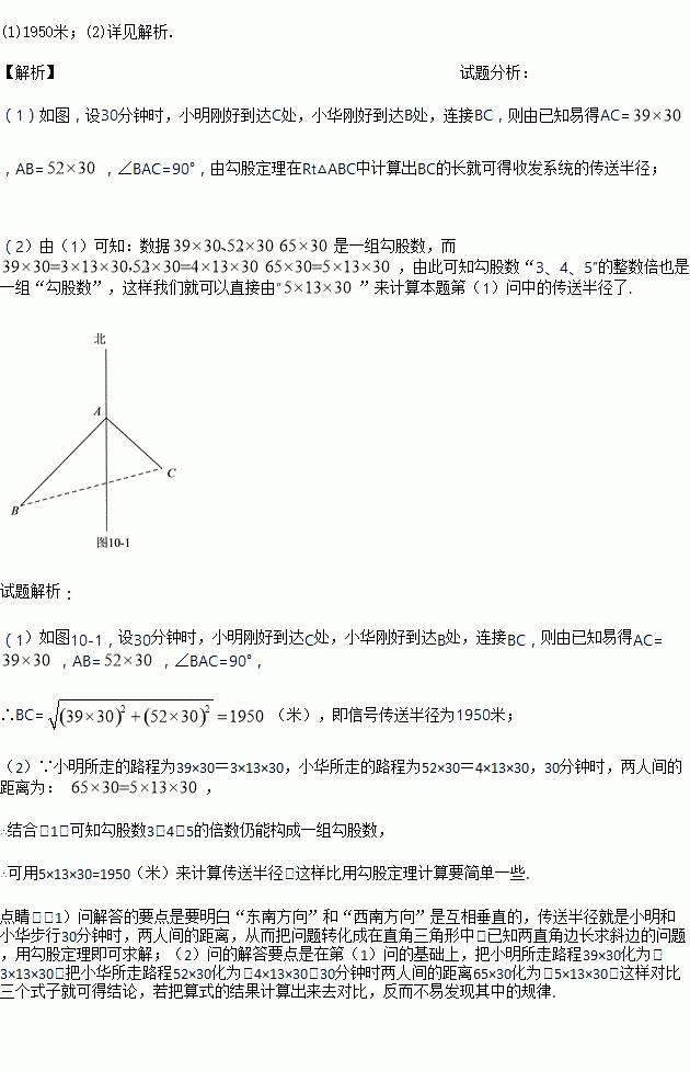 学校科技小组研制了一套信号发射、接收系统.在对系统进行测试中,如图,小明从路口A处出发,沿东南方向笔直公路行进,并发射信号,小华同时从A处出发,沿西南方向笔直公路行进,并接收信号.若小明步行速度为39米/分,小华步行速度为52米/分,恰好在出发后30分时信号开始不清晰.
