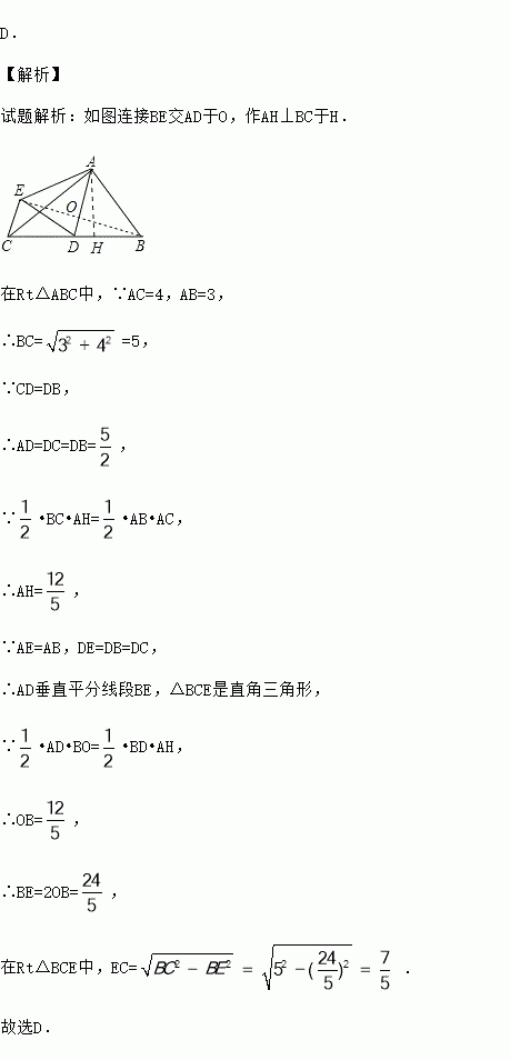 如图,△ABC中,∠BAC=90°,AB=3,AC=4,点D是BC的中点,将△ABD沿AD翻折得到△AED,连CE,则线段CE的长等于( )