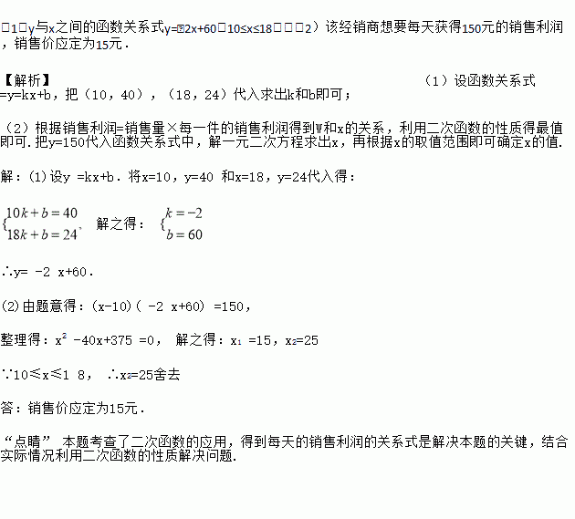 某经销商销售一种产品,这种产品的成本价为10元/千克,市场调查发现,该产品每天的销售量y(千克)与销售价x(元/千克,且10≤x≤18)之间的函数关系如图所示;