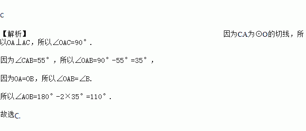 C 【解析】因为CA为⊙O的切线,所以OA⊥AC,所以∠OAC=90°. 因为∠CAB=55°,所以∠OAB=90°-55°=35°, 因为OA=OB,所以∠OAB=∠B. 所以∠AOB=180°-2×35°=110°. 故选C.