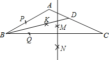 分析 (1)以点B为半径,任意长为半径画弧,交AB,BC两点为P,Q,以点P,Q为圆心,大于PQ的一半长为半径画弧,两弧的交点为K,连接CK并延长交AC于点D,BD就是所求的角平分线;