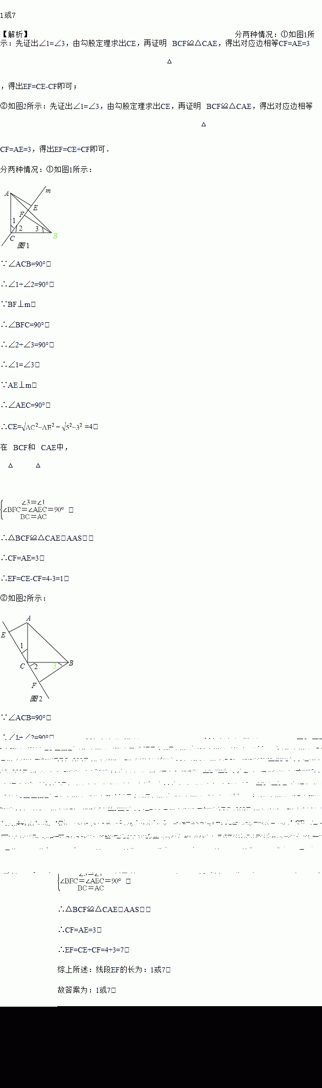 已知Rt△ABC中,∠C=90°,AC=BC,直线m经过点C,分别过点A,B作直线m的垂线,垂足分别为点E,F,若AE=3,AC=5,则线段EF的长为_______.