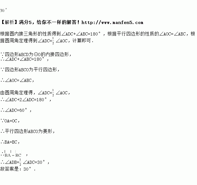 如图,四边形为的内接四边形,若四边形为平行四边形,则________.
