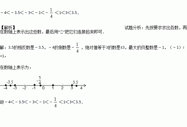 画一条数轴,并在数轴上表示:3.5和它的相反数,﹣4和它的倒数,绝对值等于3的数,最大的负整数和它的平方,并把这些数由小到大用“<”号连接起来.