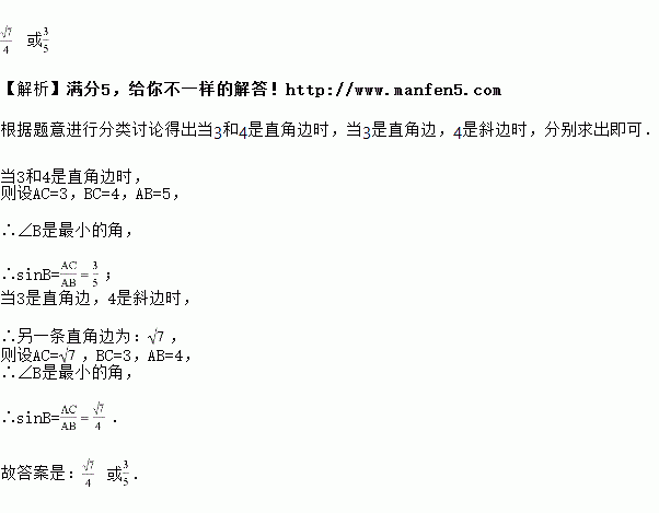 在Rt△ABC中,两边的长分别为3和4,则最小角的正弦值为____.