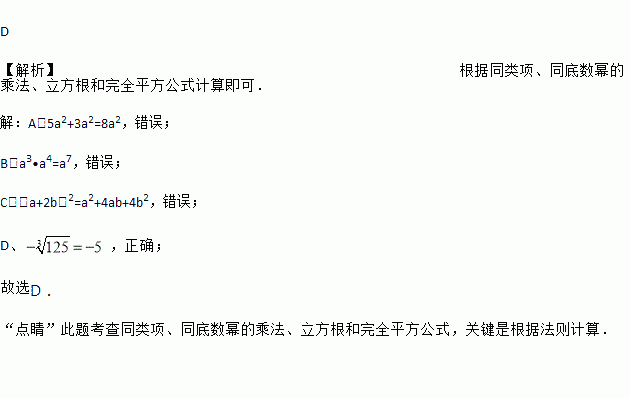 A. 5a2+3a2=8a4 B. a3•a4=a12 C. (a+2b)2=a2+4b2 D. ﹣=﹣5