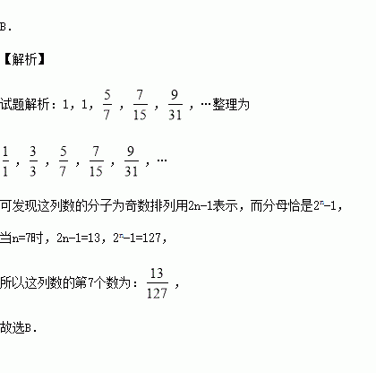 观察下列各数:1,1,,,,…按你发现的规律计算这列数的第7个数为( )