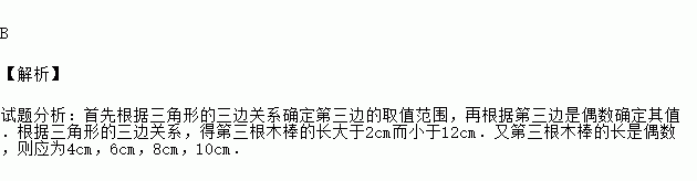B 【解析】 试题分析:首先根据三角形的三边关系确定第三边的取值范围,再根据第三边是偶数确定其值.根据三角形的三边关系,得第三根木棒的长大于2cm而小于12cm.又第三根木棒的长是偶数,则应为4cm,6cm,8cm,10cm.