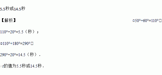 如图,Rt△AOB和Rt△COD中,∠AOB=∠COD=90°, ∠B=50°, ∠C=60°, 点D在边OA上,将图中的△AOB绕点O按每秒20°的速度沿逆时针方向旋转一周,在旋转的过程中,在第t秒时,边CD恰好与边AB平行,则t的值为 ________.