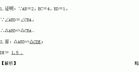 2.若DE∥AB交AC于点E,请再写出另一个与△ABD相似的三角形,并直接写出DE的长.