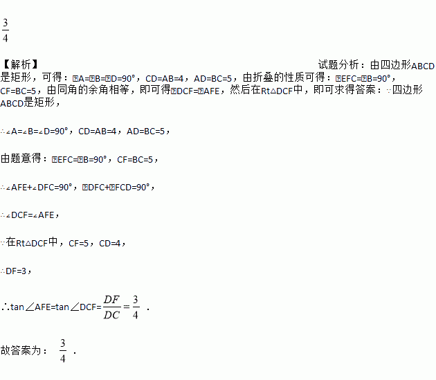 如图,在矩形ABCD中,点E在AB边上,沿CE折叠矩形ABCD,使点B落在AD边上的点F处,若AB=4,BC=5,则tan∠AFE的值为___.