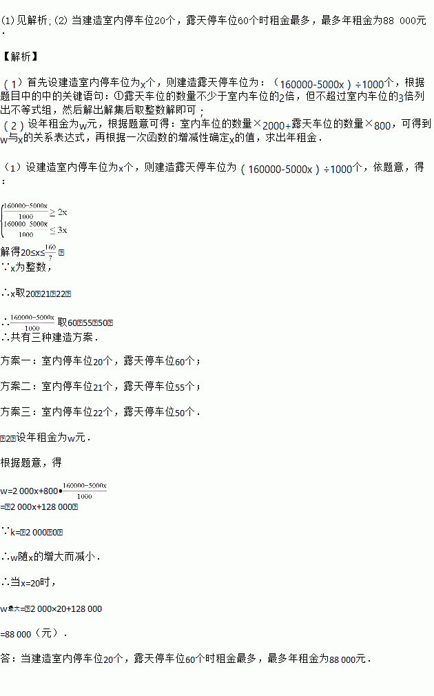 随着私家车拥有量的增加,停车问题已经给人们的生活带来了很多不便.为了缓解停车矛盾,某小区开发商欲投资16万元,建造若干个停车位,考虑到实际因素,计划露天车位的数量不少于室内车位的2倍,但不超过室内车位的3倍.据测算,建造费用及年租金如下表: