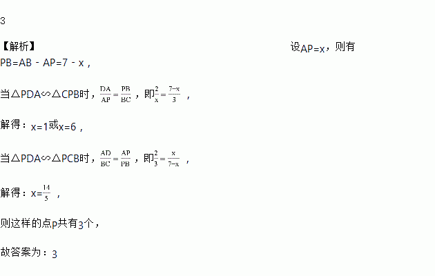 如图,∠A=∠B=90°,AB=7,AD=2,BC=3,在边AB上取点P,使得△PAD与△PBC相似,则这样的P点共有_____个.