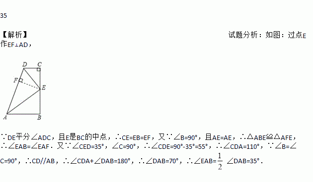 已知如图,∠B=∠C=90°,E是BC的中点,DE平分∠ADC,∠CED=35°,则∠EAB是 度.