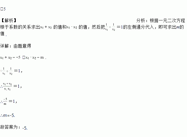若关于x的方程x2+5x+m=0的两个根分别为为x1,x2,且=1,则m=______.