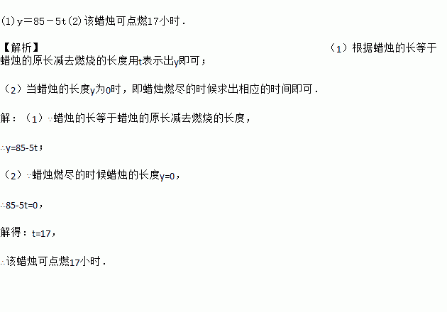 一根祝寿蜡烛长85 cm,点燃时每小时缩短5 cm.