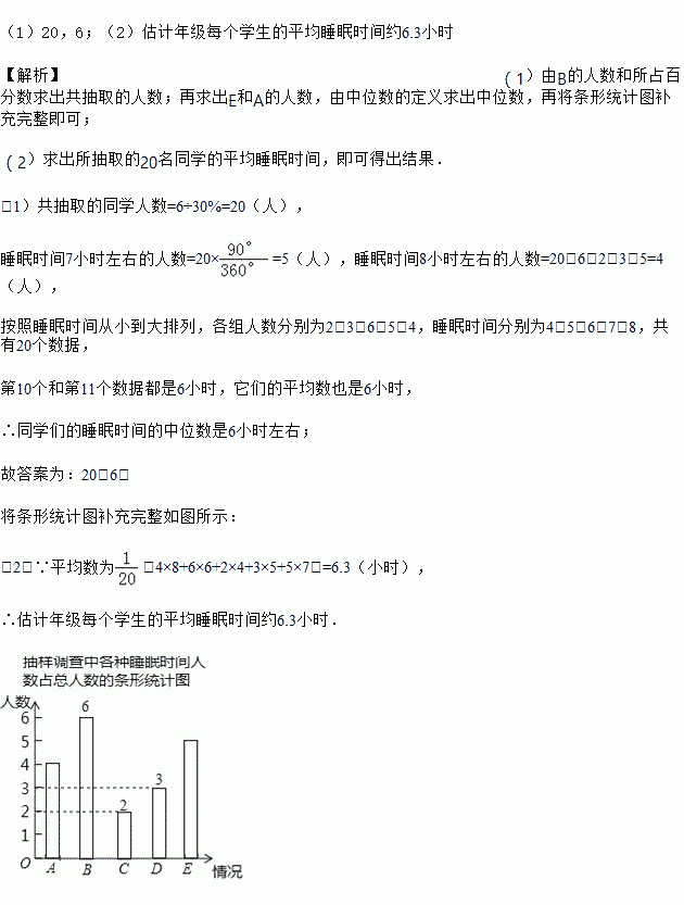 (1)共抽取了 名同学进行调查,同学们的睡眠时间的中位数是 小时左右,并将条形统计图补充完整;