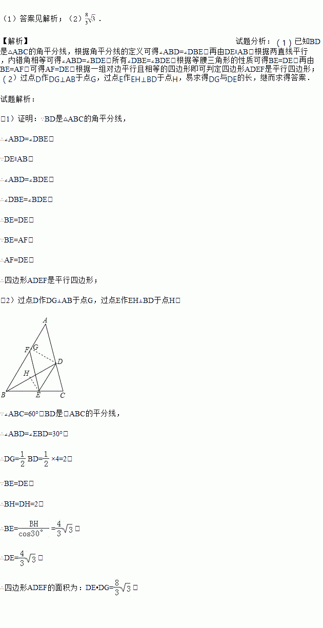 (2)若∠ABC=60°,BD=4,求平行四边形ADEF的面积.