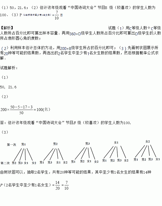 (3)若从本次调查中的A级(非常喜欢)的5名学生中,选出2名去参加广州市中学生诗词大会比赛,已知A级学生中男生有3名,请用“列表”或“画树状图”的方法求出所选出的2名学生中至少有1名女生的概率.
