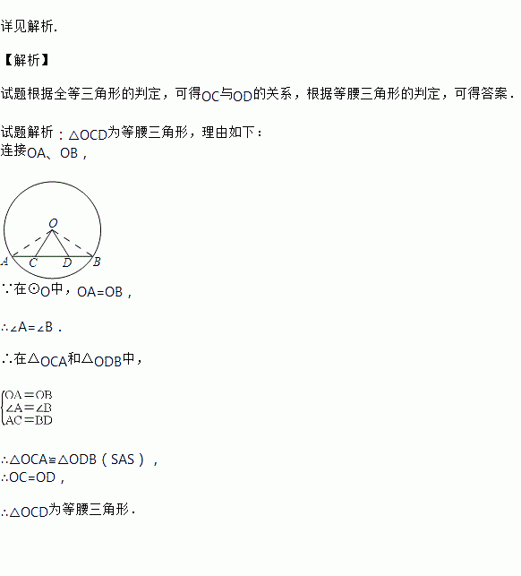 如图,AB是⊙O的弦,点C、D在AB上,且AC=BD.判断△OCD的形状,并说明理由.