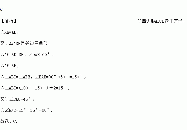 C 【解析】∵四边形ABCD是正方形, ∴AB=AD, 又∵△ADE是等边三角形, ∴AE=AD=DE,∠DAE=60°, ∴AB=AE, ∴∠ABE=∠AEB,∠BAE=90°+60°=150°, ∴∠ABE=(180°?150°)÷2=15°, 又∵∠BAC=45°, ∴∠BFC=45°+15°=60°. 故选:C.