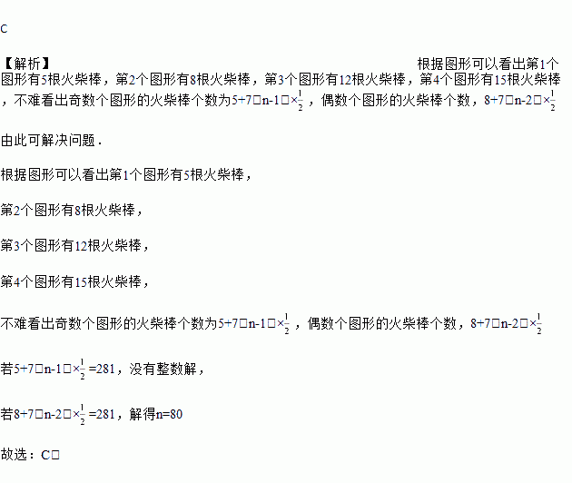 如图表示的是用火柴棒搭成的一个个图形,第一个图形用了5根火柴,第二个图形用了8根火柴,…,用281根火柴棒搭成了第( )个图形.