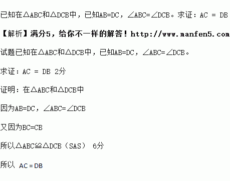 如图,在△ABC和△DCB中,下面有三个条件,请你以其中两个为题设,第三个作为结论,写出一个正确的命题,并加以证明.