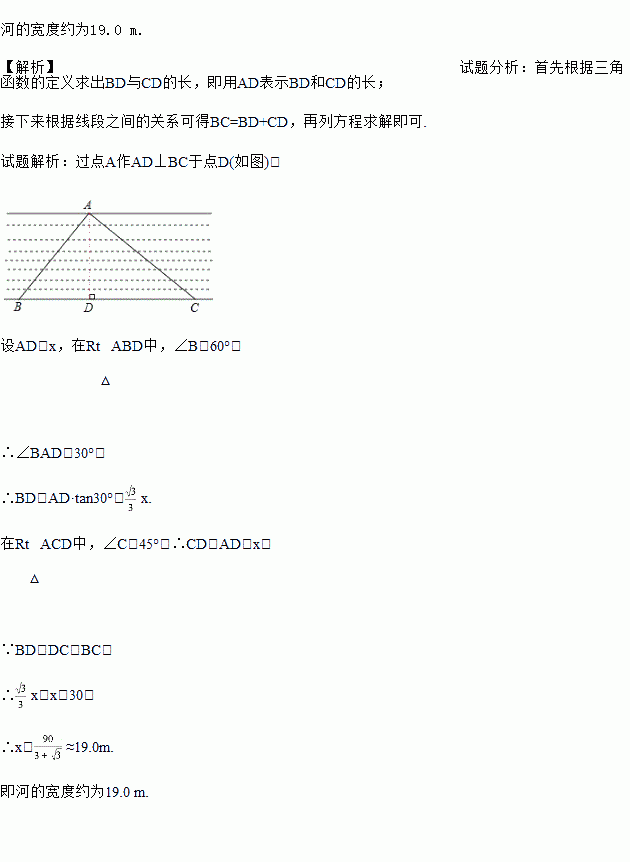 如图,河对岸岸边有一点A,在河边取两点B、C,使得∠ABC=60°,∠ACB=45°,量得BC=30 m,求河的宽度(精确到0.1 m).